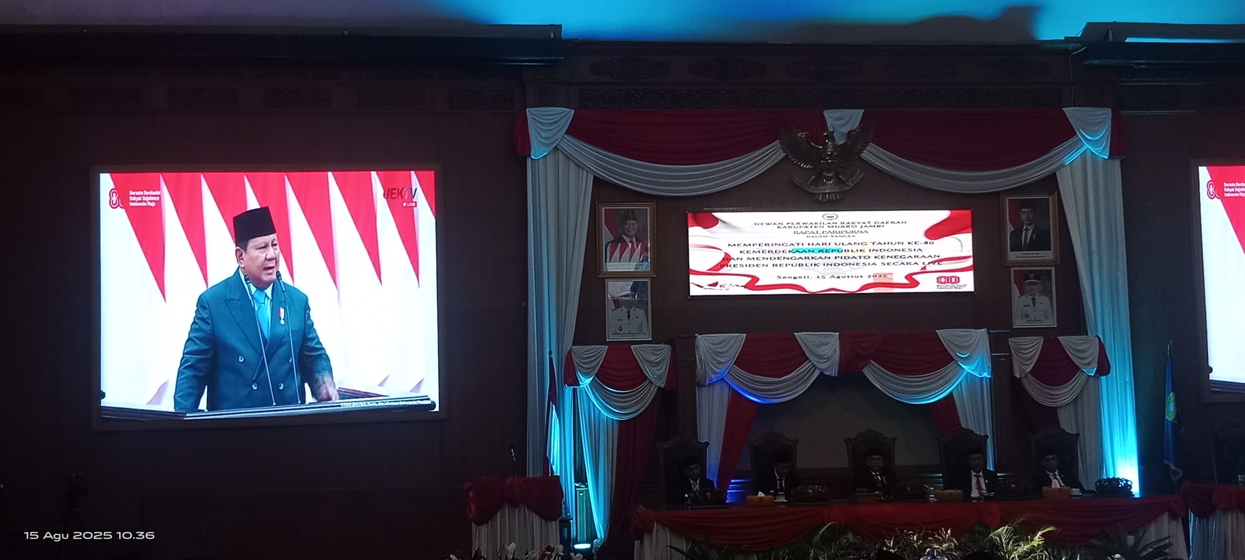 Dalam Sampainya Ketua DPRD Kabupaten Muaro Jambi Aidi Hatta mengatakan pada hari ini kita akan mendengarkan pidato kenegaraan presiden Republik Indonesia dalam rangka memperingati hari ulang tahun Republik Indonesia ke 80 tahun di ruang rapat utama ini secara live.